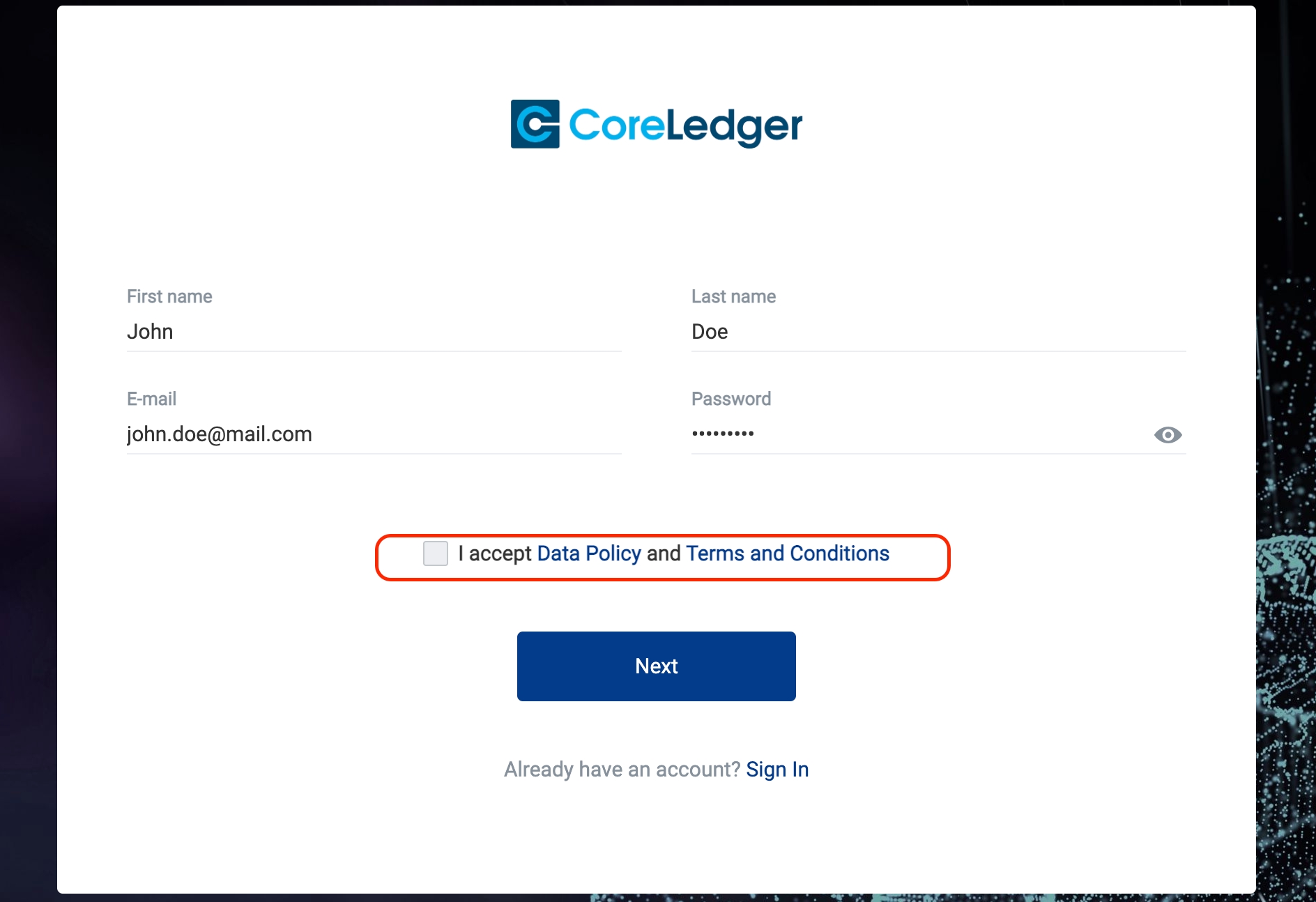 Now customized tenant-specific Terms and Conditions and Data Policy can be accepted by the user already when registering to the system if tenant setup with TEOS Authentication service is used. To use this feature, tenant admin must provide either link to the page with project's T&C and Data Policy published somewhere else or provide HTML files with T&C and Data Policy to the CoreLedger manager.